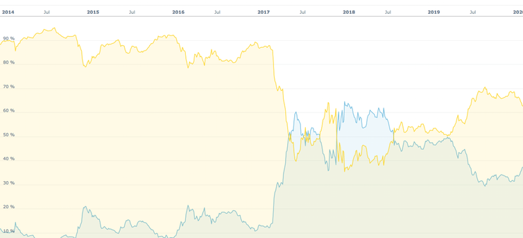 Cryptocurrency aficionados compare bitcoin and the altcoins in terms of bitcoin dominance. This refers to bitcoin’s market size compared with the rest of the altcoins put together. During the early weeks of 2020, it fell slightly from 68% to 64%. As the chart below shows, this is a shift from what has happened for most of the past couple of years.