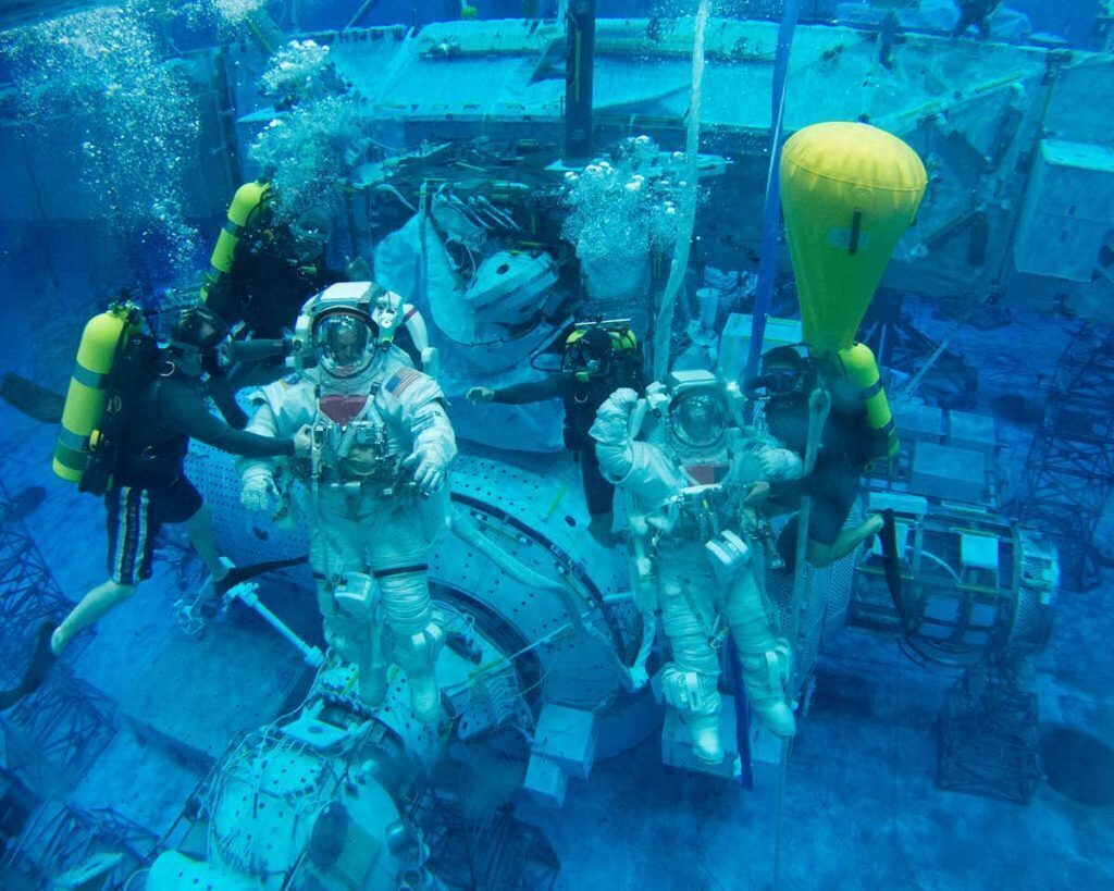 Longer periods of weightlessness can be created in vast swimming pools such as NASA’s Neutral Buoyancy Laboratory. There, astronauts, kitted out in full spacesuits, can train alongside full-size mock-ups of ISS modules. This allows crews to carry out run-throughs of upcoming missions.