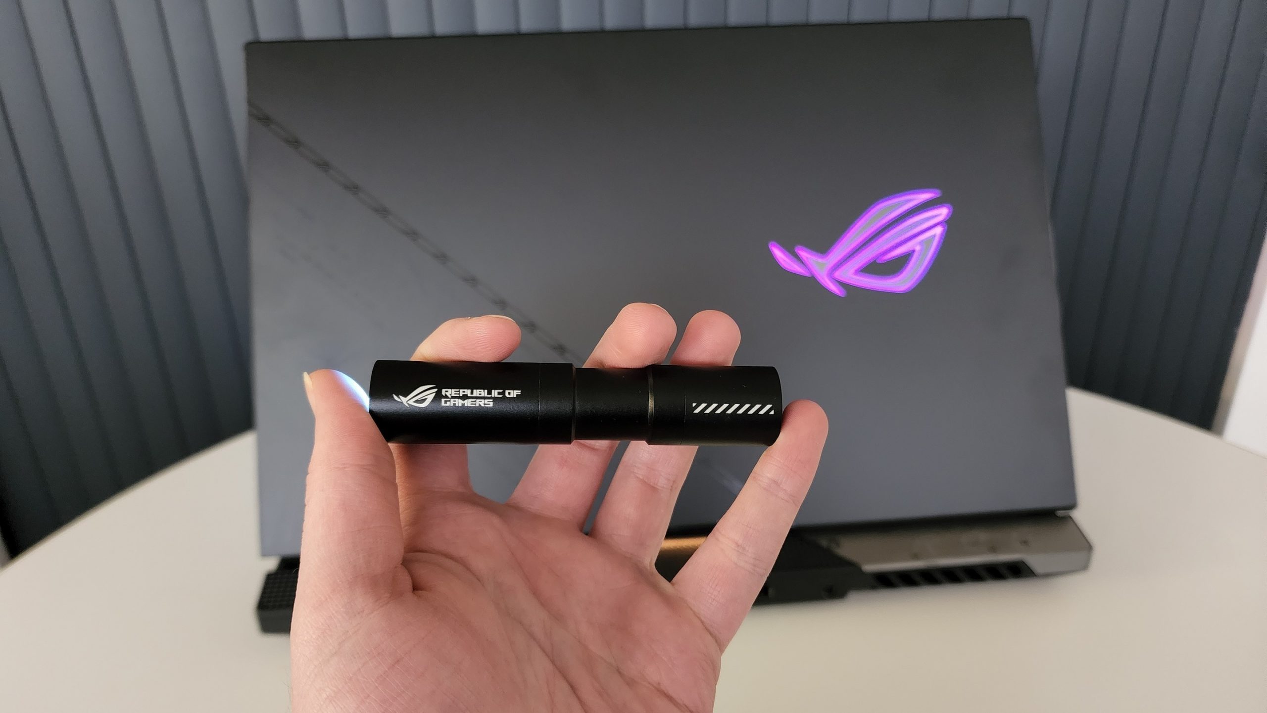 There is one key difference on the outside. The anodised metal lid has a hidden message but it’s only visible by way of UV light. Luckily, Asus has included one in the box along with a backpack for you to cart this monster around. Thanks, Asus. We noticed that it also tends to hold on to dust and fingerprints, so you might want to keep a lappie in that bag as well.