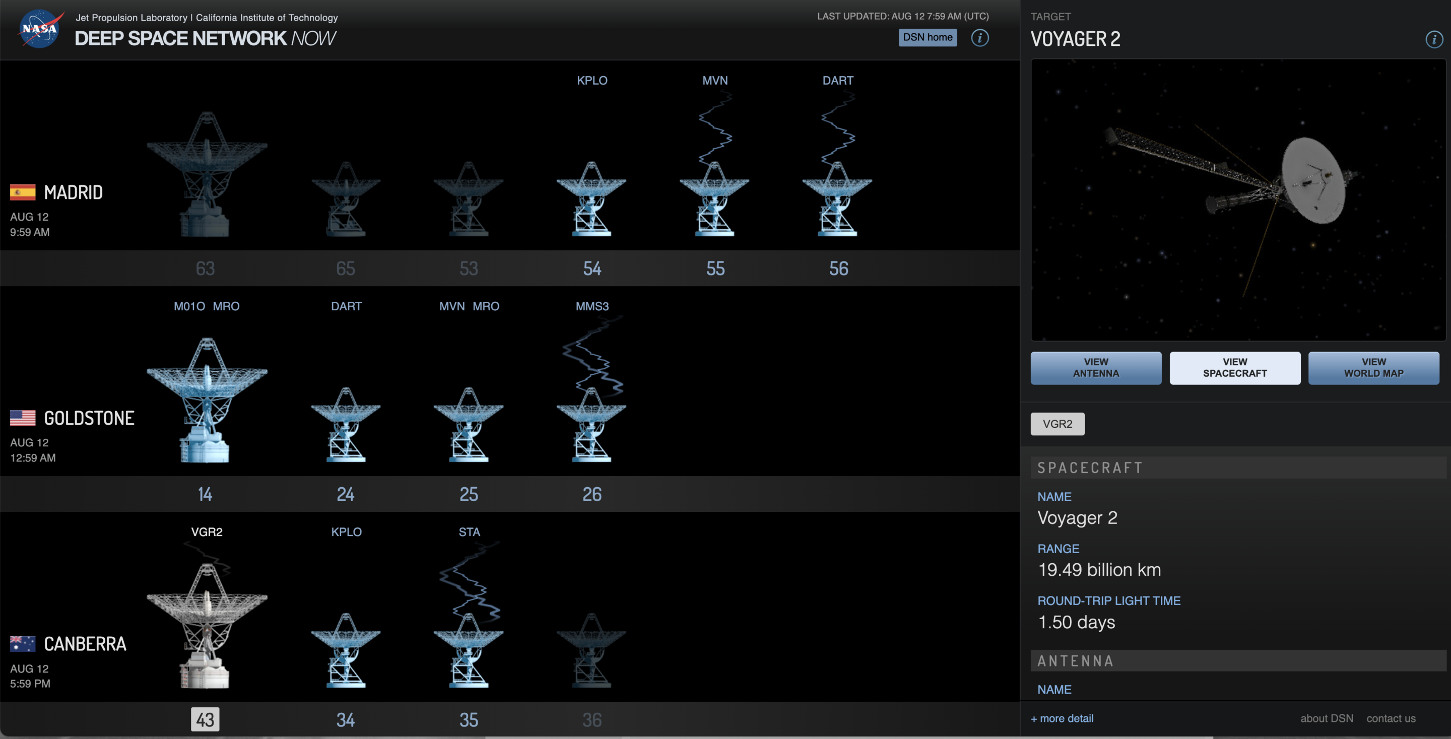 Both spacecraft send reedy signals that wend their way between the planets to the three antennas which are still listening: Tidbinbilla, Goldstone and Madrid.