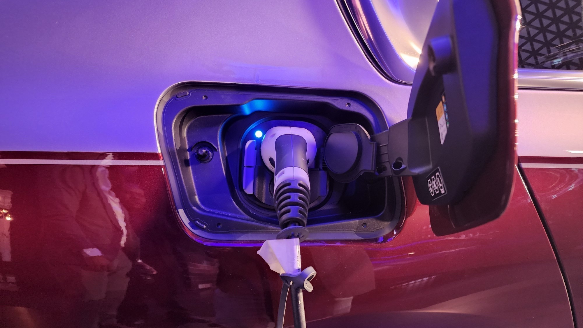 The illuminated grille is rather slick, but the front-end design is a little different to its fossil fuel-burning companion. The major aspect we would have liked to have tested was its takeoff from a standing start. Sadly, we didn’t get to explore its EV-provided torque. That would have meant moving a considerable amount of furniture and people, and it just wasn’t that sort of party.