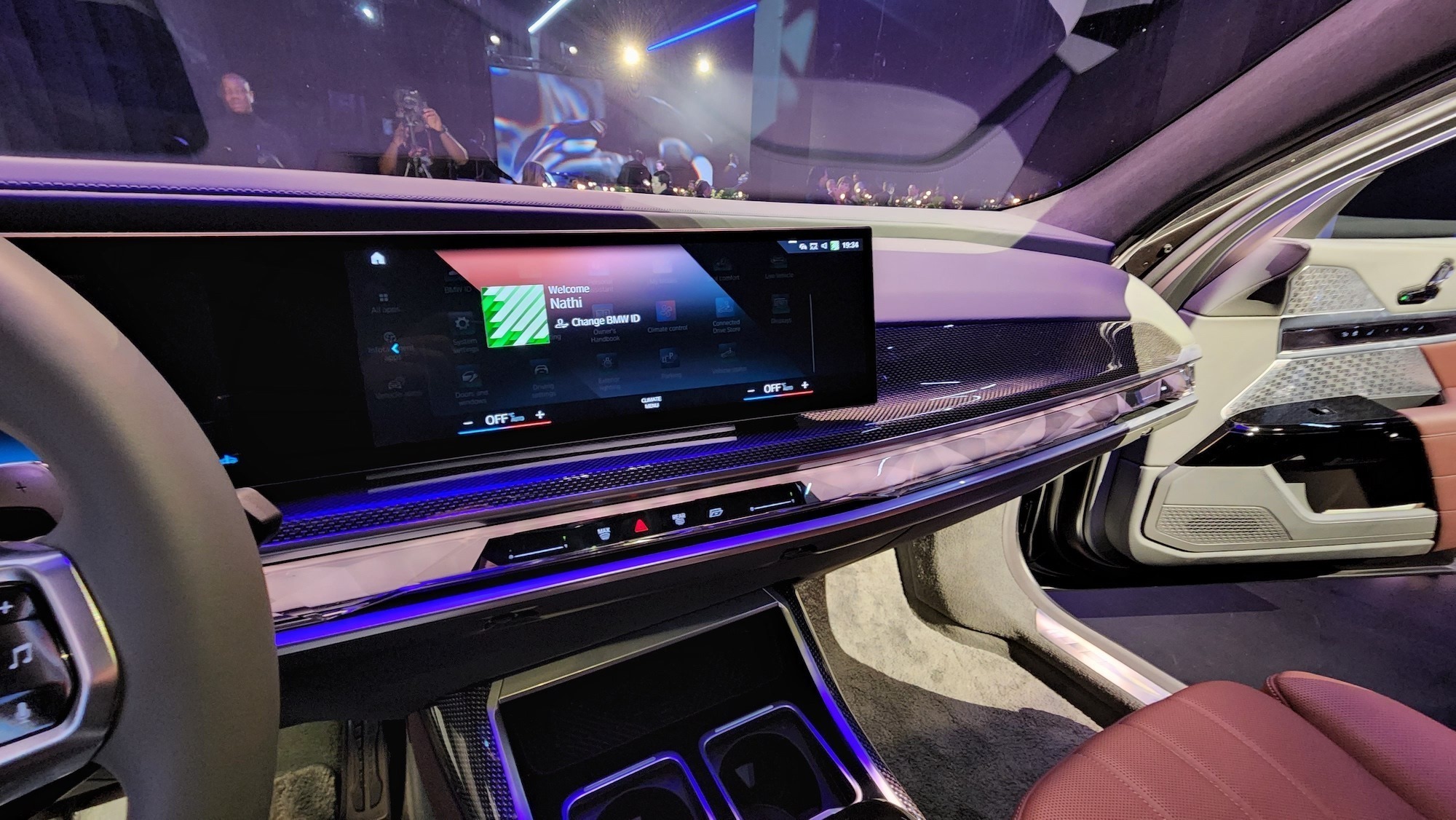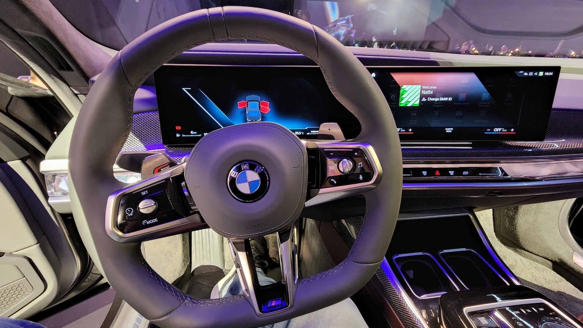 There’s a massive curved display facing the driver. BMW is de-emphasising physical controls, so everything is touch-enabled. There’s a collection of physical controls in the centre console, but not as many as you’d think. The gear selector is there (it’s also a Swarovski crystal), as is a rotating selector (also a Swarovski crystal). For the most part, you can interact with touchscreens and a new interactive bar that stretches across the cabin. It’s also found in the X7 SUV and the i7, of course.