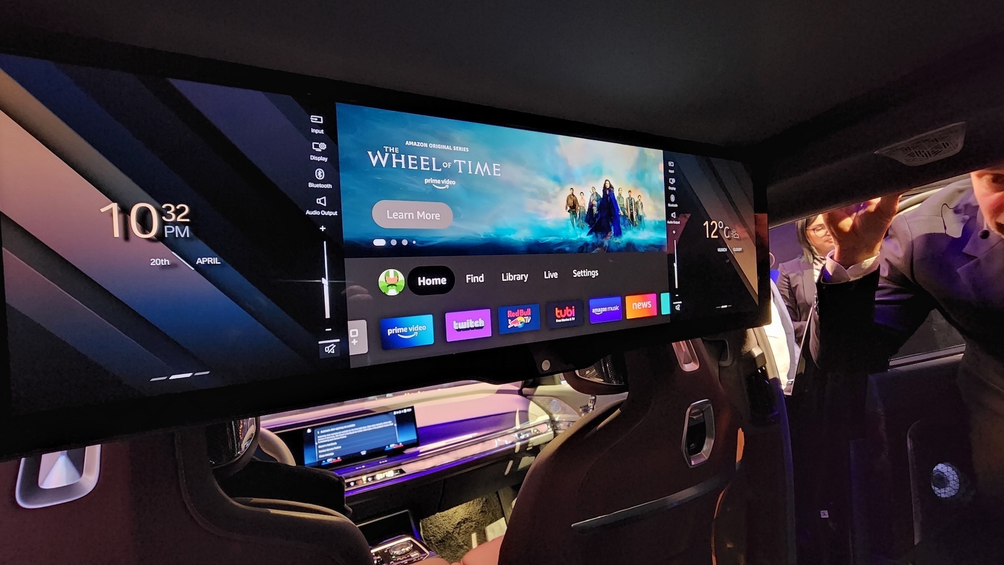 But if the front is packed with tech, it’s got nothing on sitting in the rear. The seats are deep and plush and there’s plenty to do in the back. Like… streaming Amazon Prime. BMW’s got a 31in 8K display living on the ceiling of the 7 Series. It slides down into Theatre mode at the touch of a button, which lives in touchscreen control panels on either rear door.