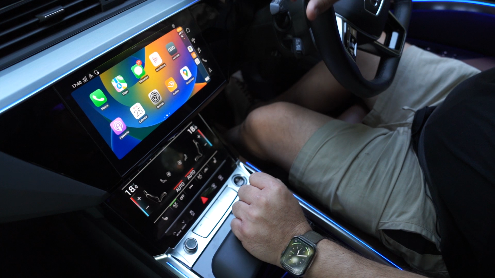 There are two touchscreens, which display either Apple’s CarPlay, Android Auto, or Audi’s own MMI interface. The bottom one often had the climate control interface as its default, which is very handy, especially during the mini hot patch we drove it. But it also cleverly works as an input screen – with either a keyboard or writing input – which I used to navigate and find 702’s FM frequency.