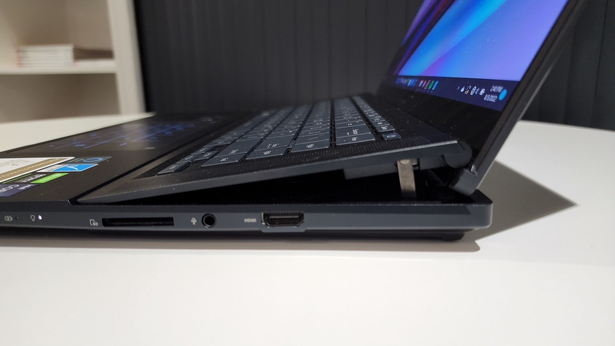 Much like with its dual-monitor laptops, Asus has implemented a hinged design to raise the keyboard of the Zenbook Pro 16X. This allows for a 30% increase in airflow, according to Asus’ in-house testing. More cool air flowing over the internals is a good thing. Not just for your personal bits underneath the laptop or your palms resting on top but also for the hot bits inside. The cooler you can get them, the better they will perform.