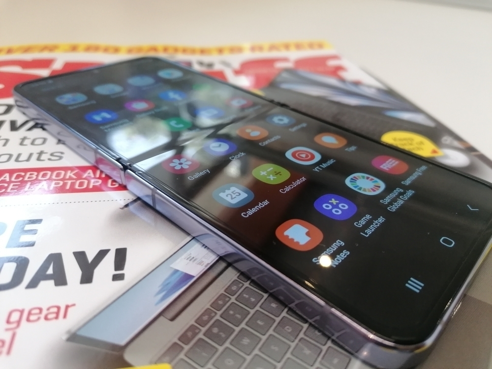 Once opened, you’re met with a 6.7in Dynamic AMOLED foldable glass screen. That pesky crease is still present. Don’t expect that to disappear any time soon. It’s slightly less pronounced than the crease on the Flip 3, which is good, we guess.