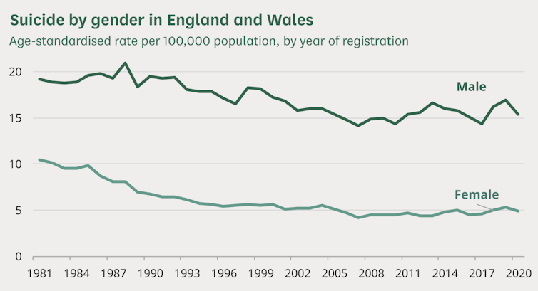 There were 5,219 recorded deaths by suicide in England in 2021. While the suicide rate in England and Wales has declined by around 31% since 1981, the majority of this decrease happened before 2000. Suicide is three times more common in men than in women, and this gap has increased over time.