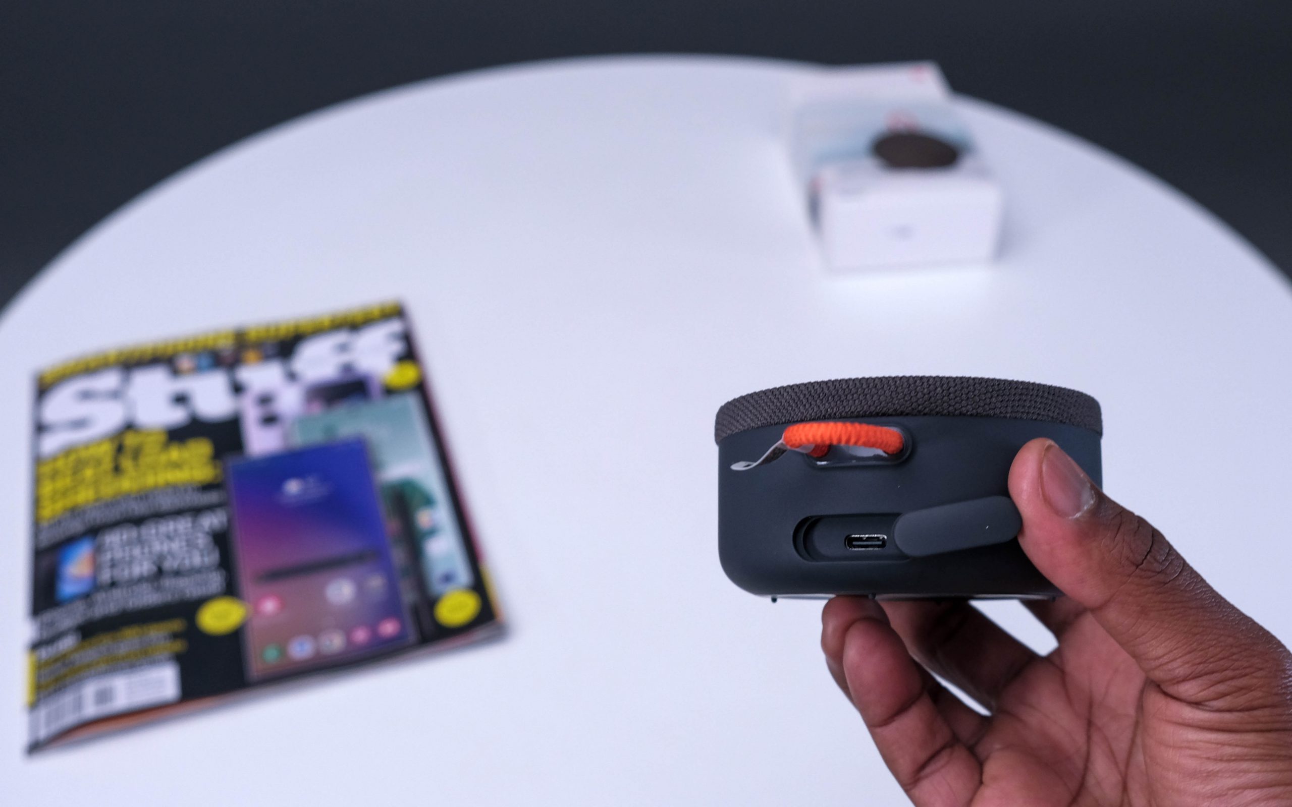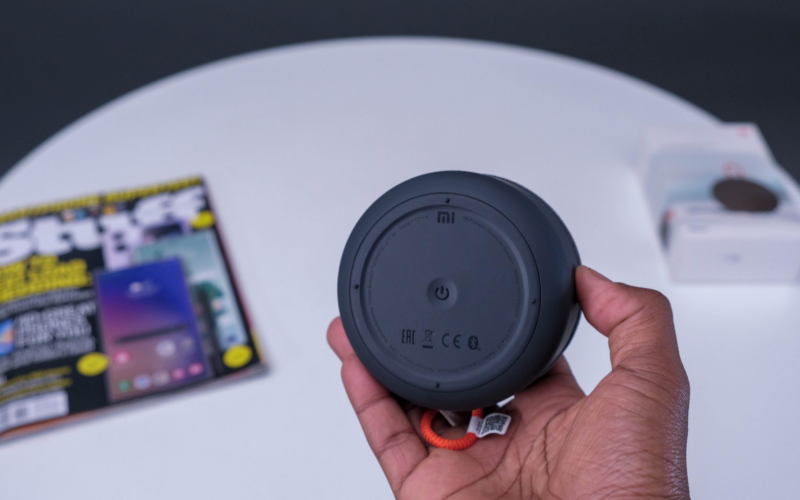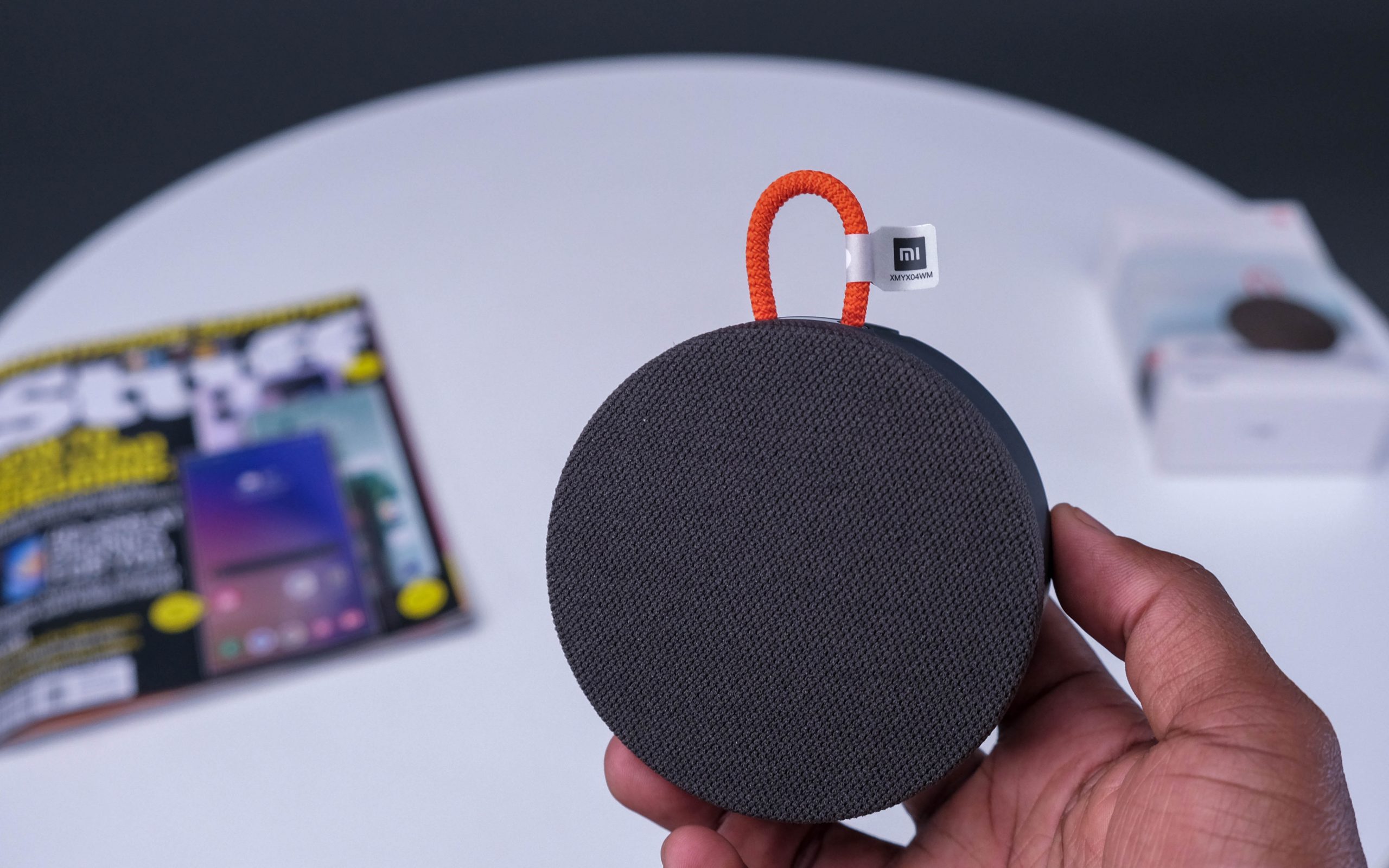 The reason for our initial underestimation involved the Mi Portable Bluetooth speaker’s build. The small grey puck-shaped object is about the size of a human palm and is about two fingers thick. Since we’re using the human hand as a yardstick, there’s also an orange loop just right for jamming over a thumb. But that’s… about as far as it goes. There’s only a single button, on the base of the unit, that handles all of the physical functions. Finally, there’s a USB-C charge port concealed behind a substantial plastic plug. As Bluetooth speakers go, there’s almost no additional fat on it at all.