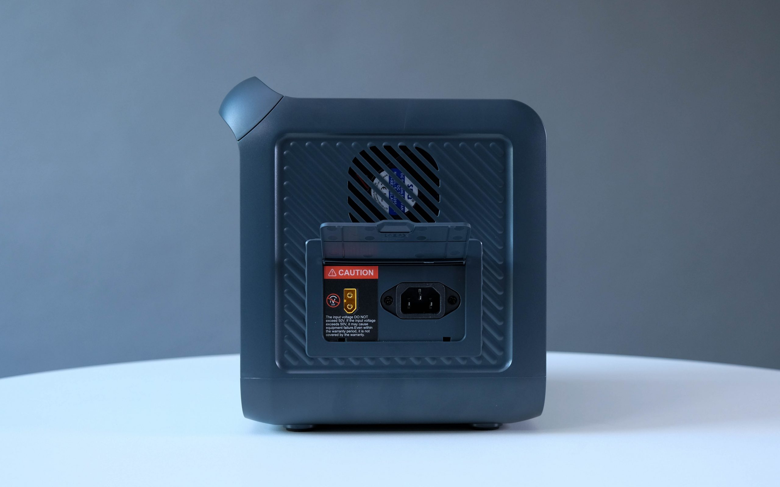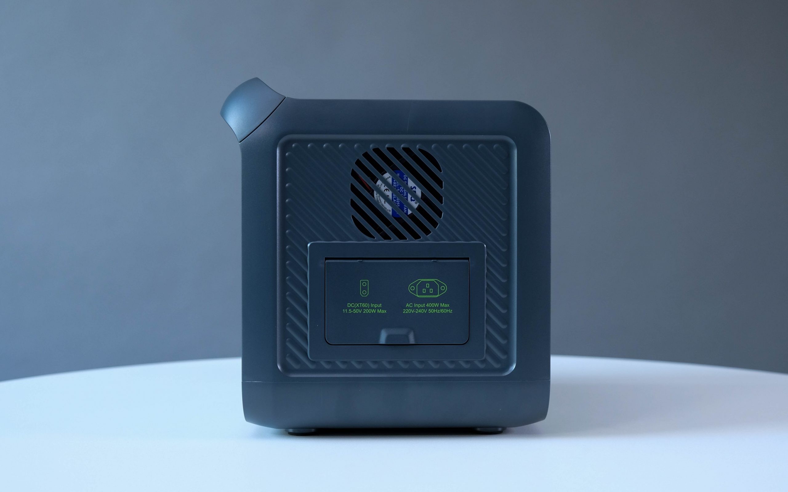 The sides aren’t unadorned. The left (if you’re facing the front of the unit) is where a flap concealing the XT60 (the oddly-shaped yellow port) and the kettle chord input lives. The right is where the Type D (three-prong) input is situated. The sides are bracketed by large intake ports with cooling fans. Finally, the top is where the carrying handle is. This is a plastic protrusion that, while solid, gives a hollow impression when you’re lugging this thing around. It won’t break but it feels as though it might one day decide to go on holiday.