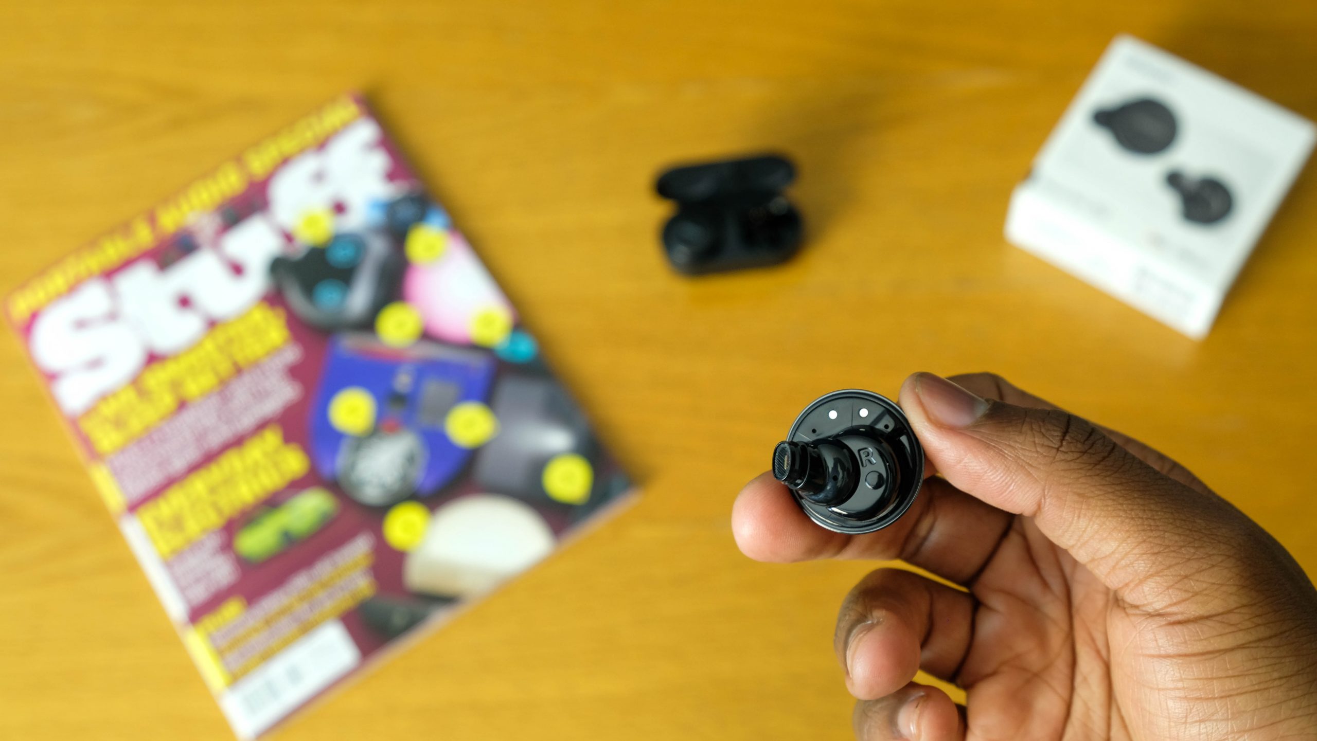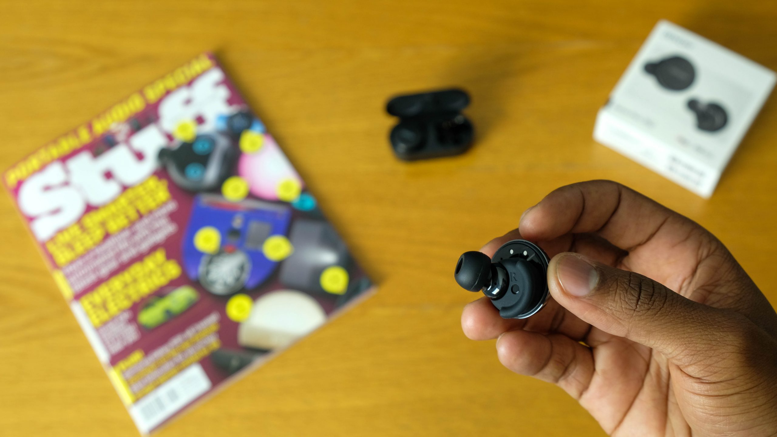 Inside the case are the buds themselves. They are… large. Not comically unwieldy, though part of us thinks that would be hilarious. The buds weigh a little under nine grams each, which is heavier than we’re used to. Most of this weight has to do with Denon’s choice to perform considerable self-advertising.