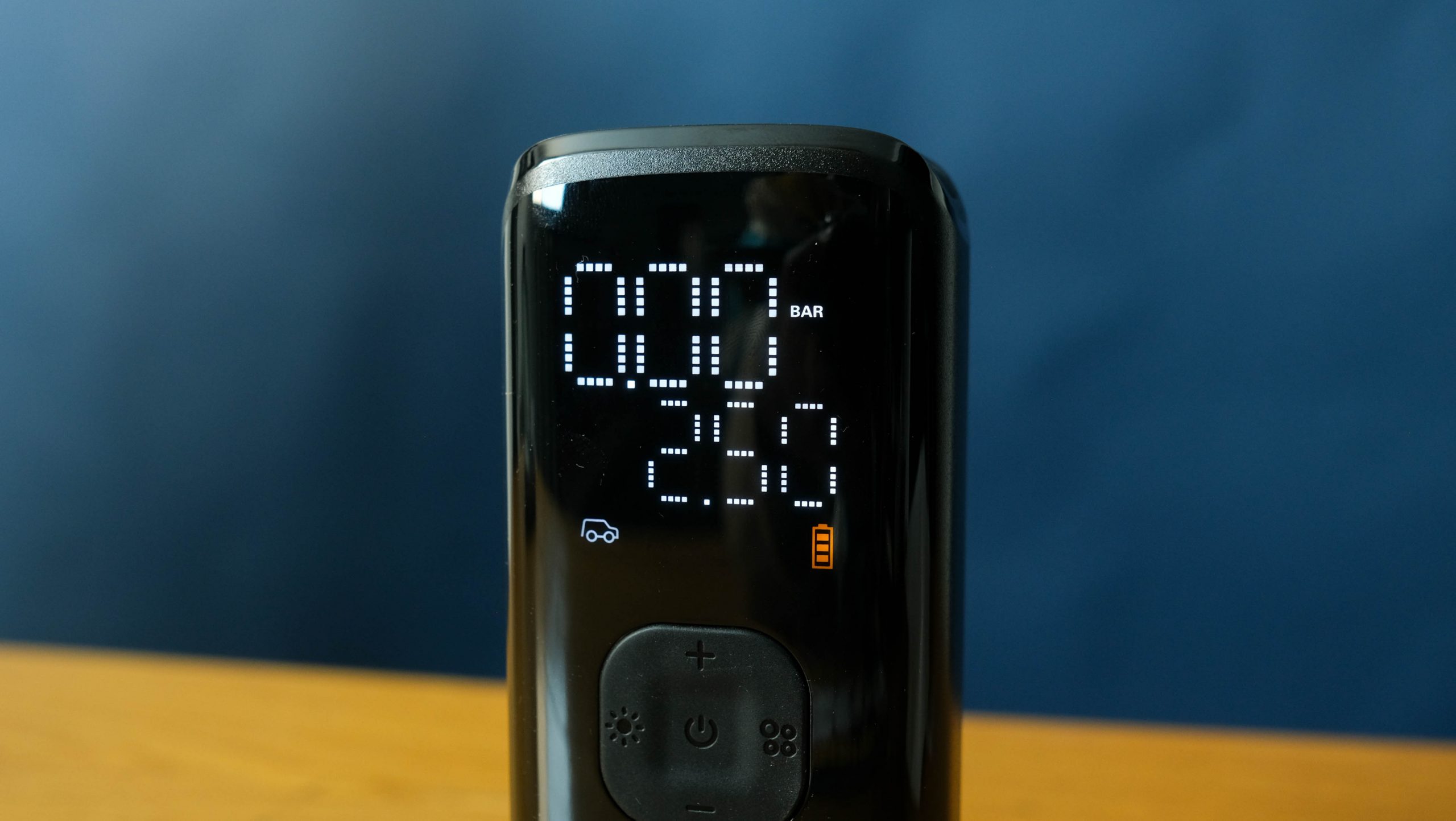 Assuming you’ve got the main cable attached, usage is a matter of selecting the correct adaptor — car tyres just use the cable as-is — and choosing the right charging profile on the screen. There are five in total, covering cars, motorcycles, bicycles, balls, and then a custom setting that… actually, we’re not sure why that’s there. Maybe for blowing up small air mattresses? Inflate car and motorcycle tyres and you’ll measure units in bars, while the others are measured in PSI. This little air compressor outputs as little as 2 PSI and as much as 150 PSI.