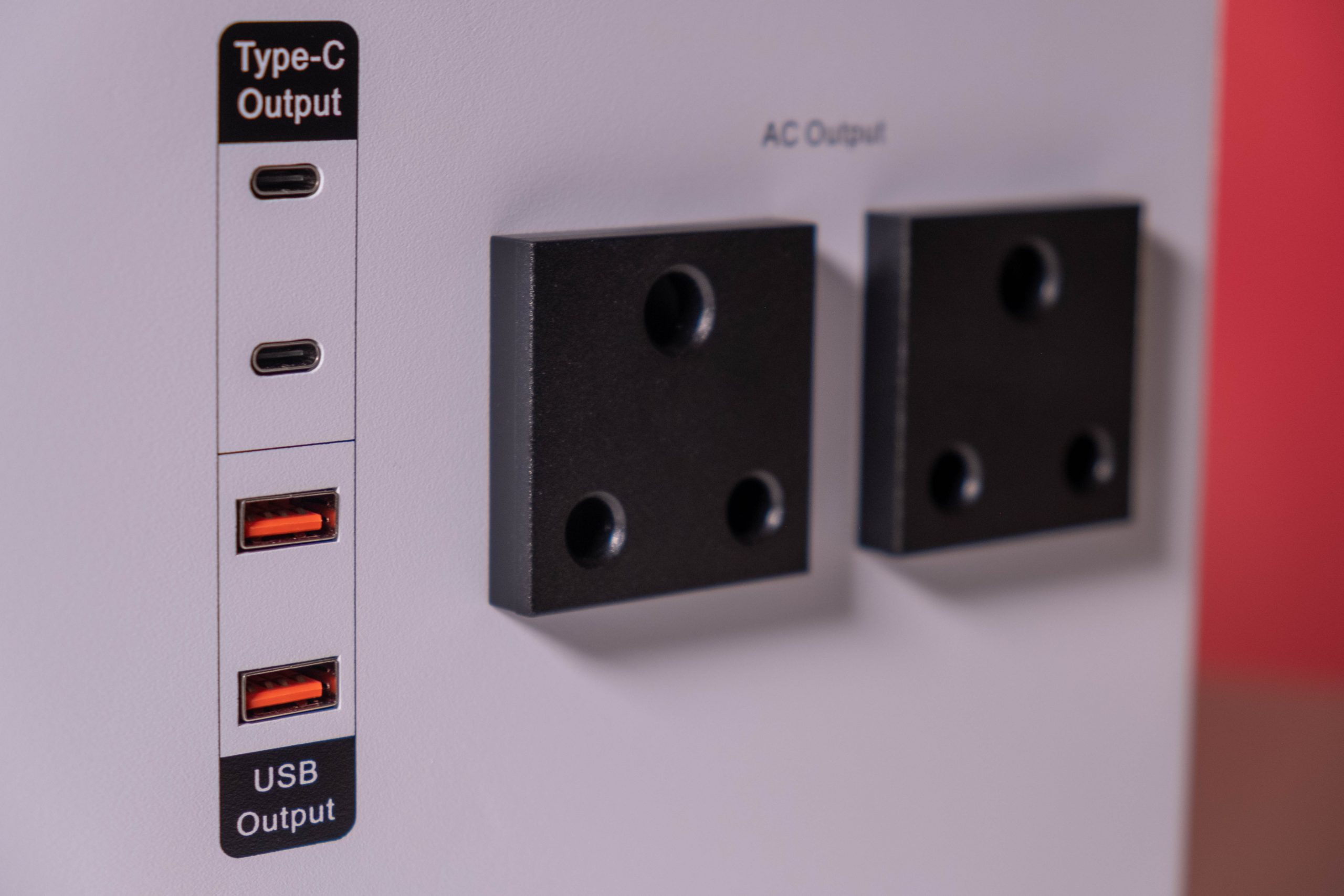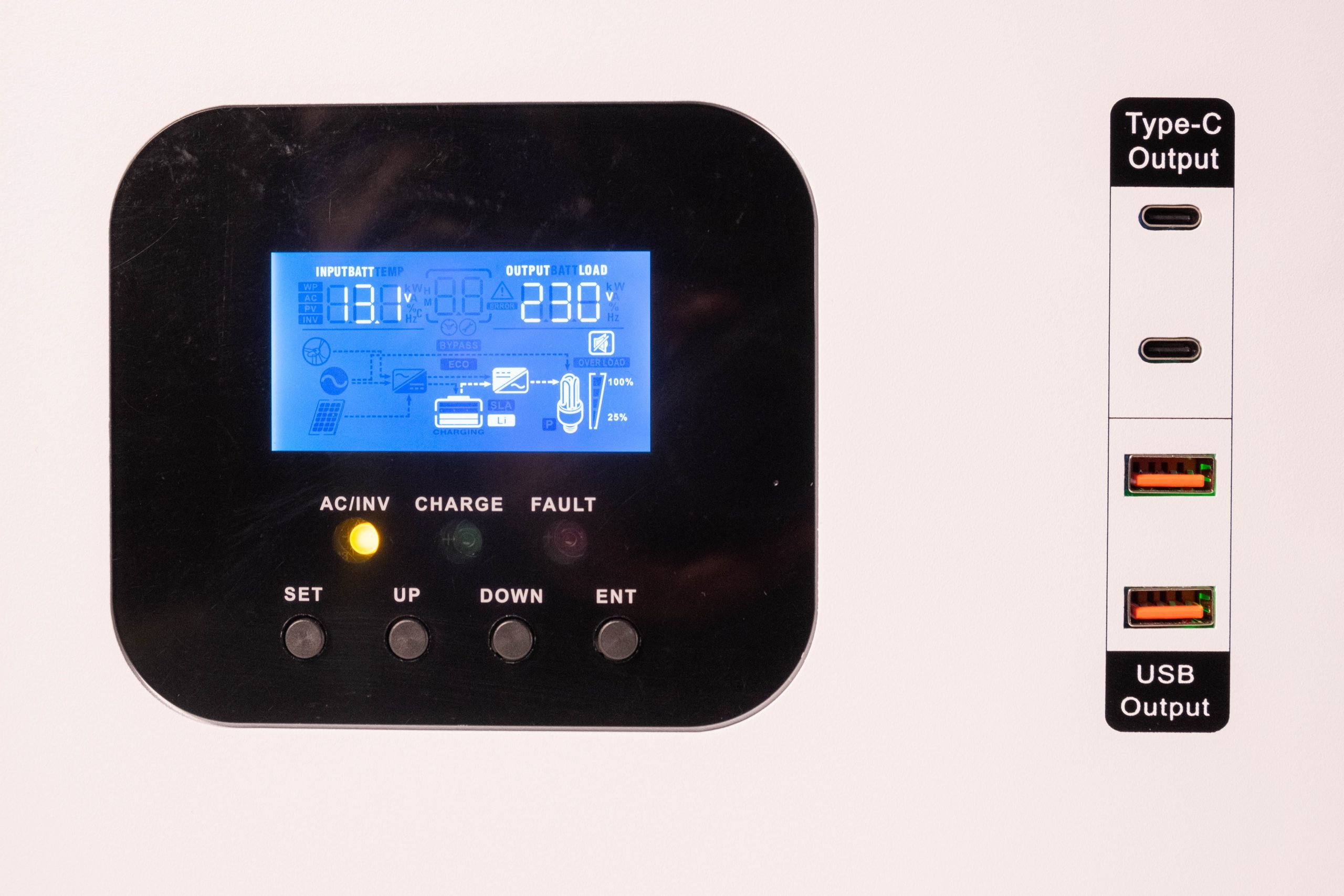 There are ports and switches on three of the four vertical faces. Up front is a pair of Type D sockets. Just to the left of this is a mysterious LED display and some indicator lights. There’s also a collection of USB ports (A and C) in between these two. The right-hand edge has a couple of switches — main power and the Battery Management System — and a breaker for those rare times when you overload the AC power. The right is a little more complex. There’s a reset button, a switch for the USB ports, and a couple of more arcane ports that we’ll get to. This is also where you’ll plug the Lumo Powerall 1.5 into the mains.