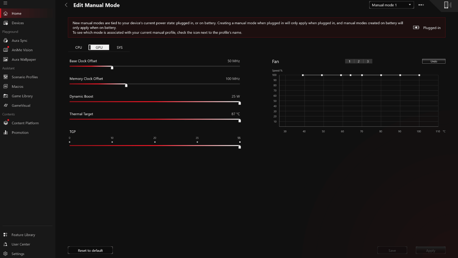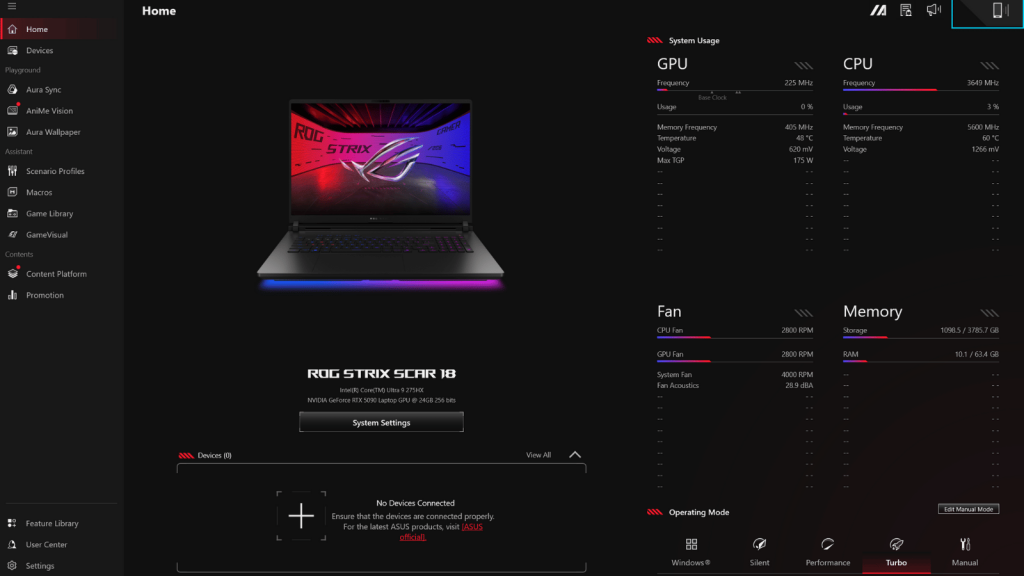 Asus provides three power profiles inside Armoury Crate – quiet, performance, and turbo. There’s also the option to manually overclock the CPU and GPU and adjust the fan curves if you’re into that. We stuck with the turbo profile to mimic the performance the average user would see.