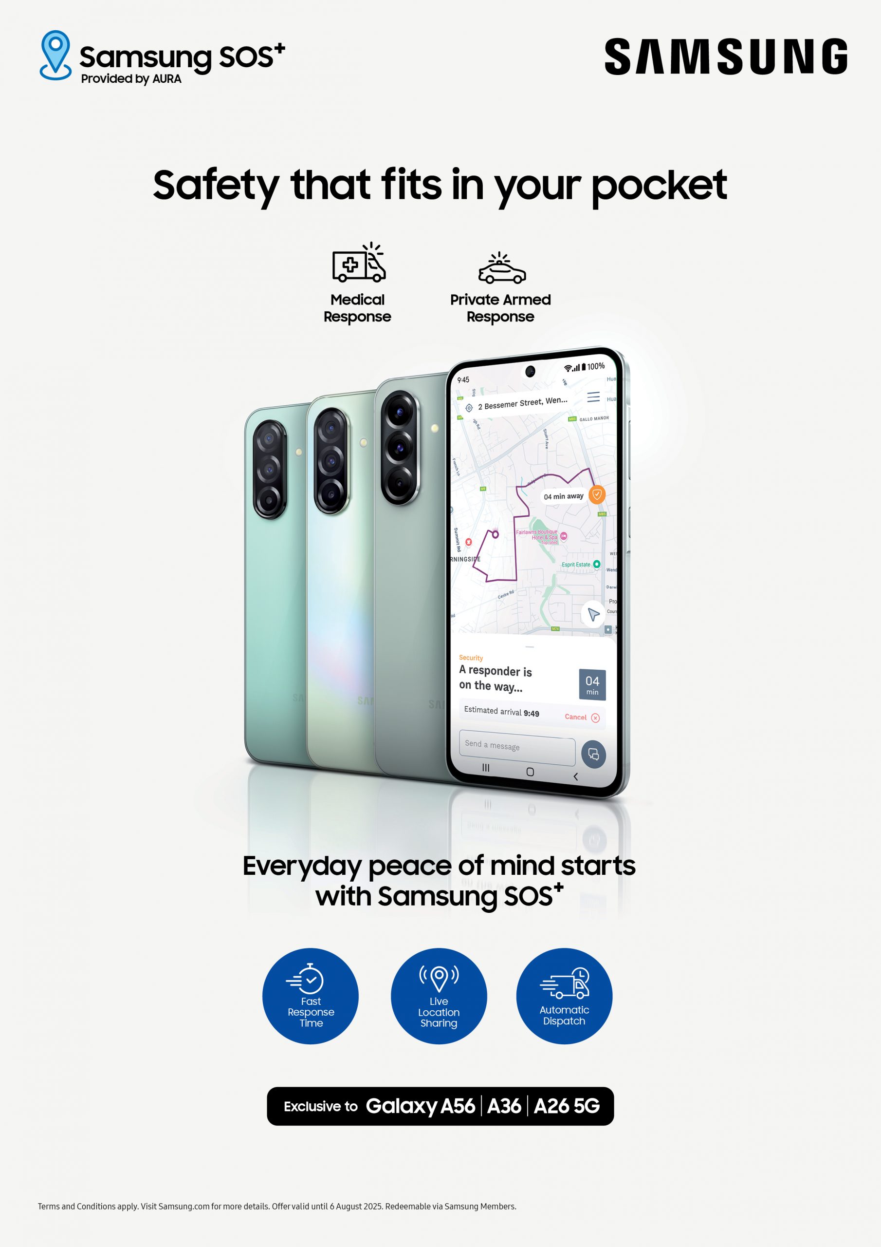 Samsung South Africa has partnered with AURA to officially launch Samsung SOS+, a free-to-use, 24/7 subscription service exclusive to the new Galaxy A56, A36, or A26 device owners. In an emergency situation and on demand, the service will immediately geolocate you and send traceable private security and medical emergency services, giving you peace of mind wherever you are in South Africa. This makes the latest Galaxy A Series the ultimate all-in-one safety solution in your pocket, combining communication, smart tech, and personal security in one package.