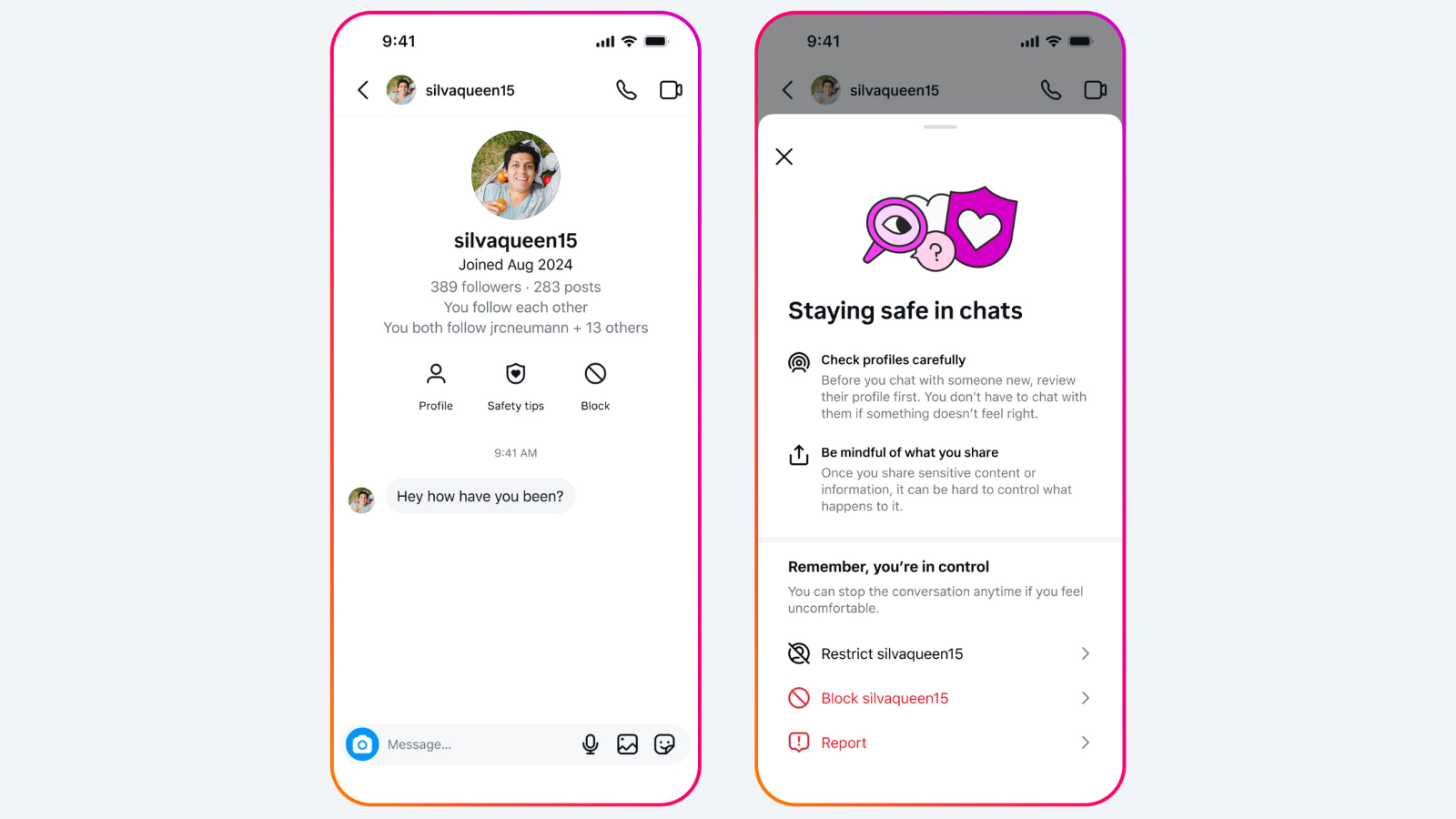 Instagram’s teen accounts will gain new “Safety Tips” — displayed at the top of a conversation inside DMs. Clicking this screen will bring up a list of buttons allowing the user to restrict, block, or report the user. Or, if you’d rather report and block simultaneously, Meta is also launching a button that combines the two.