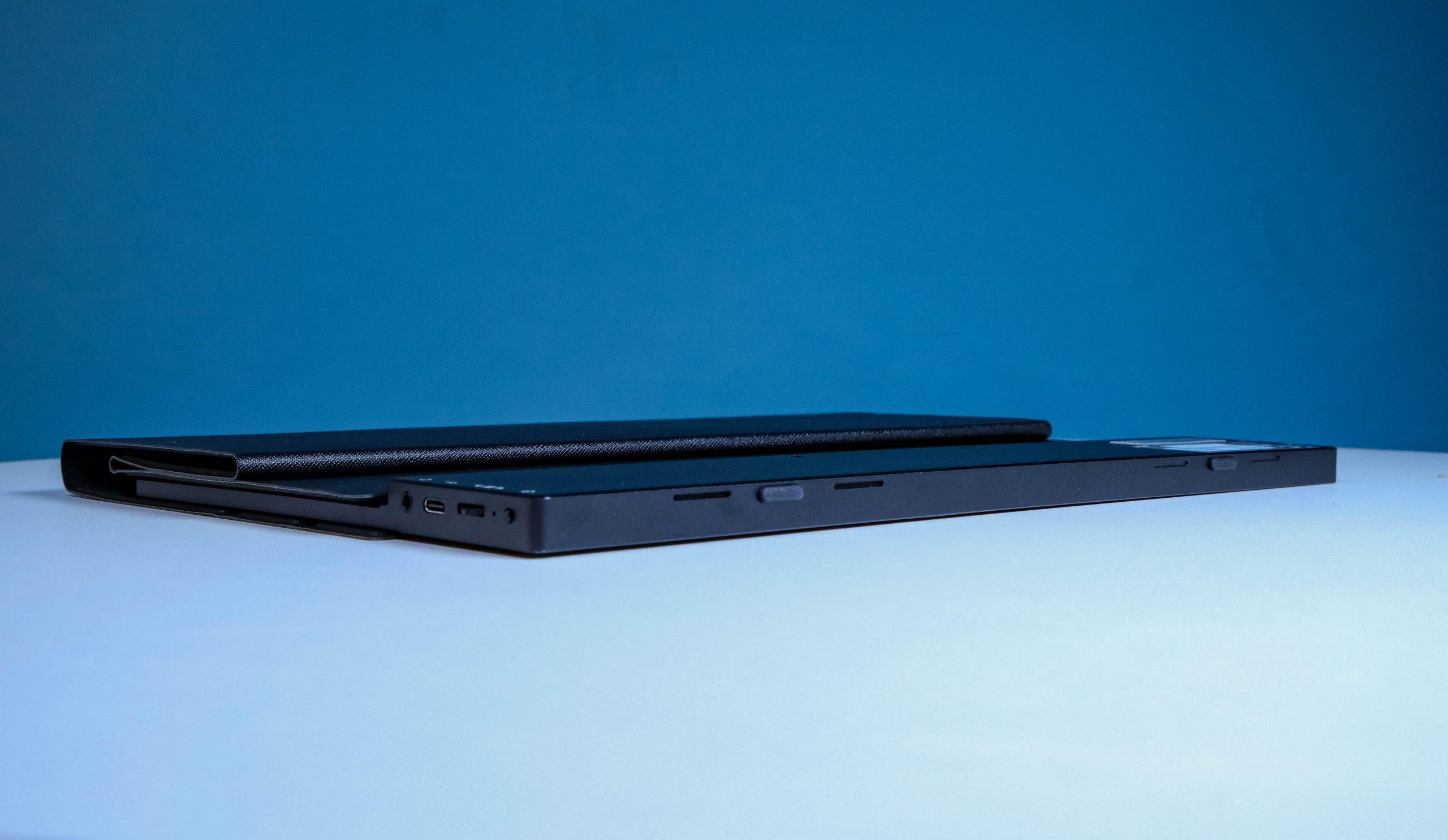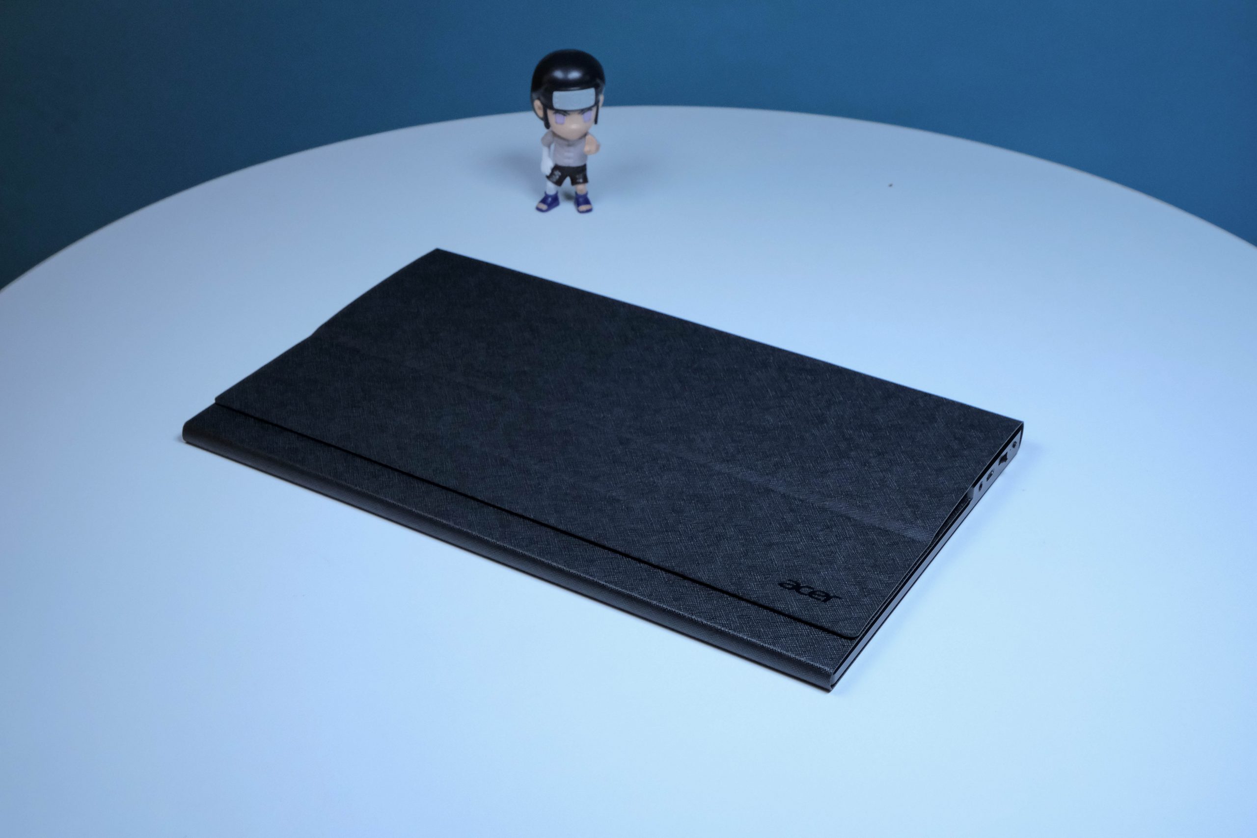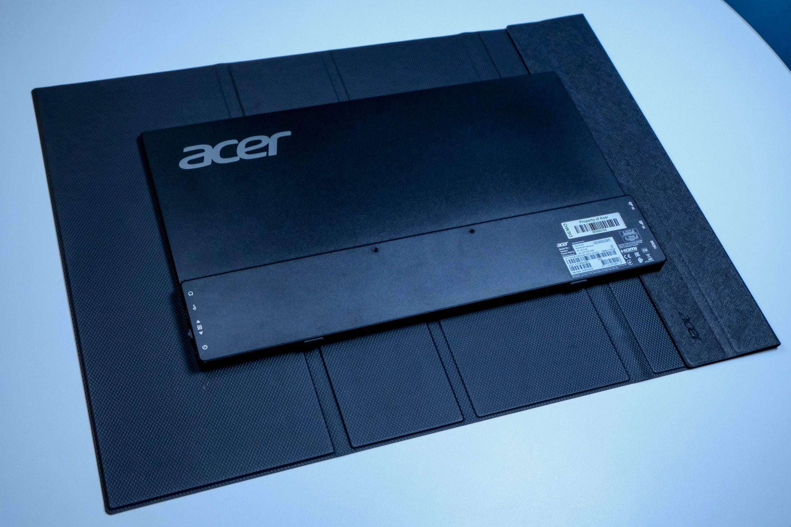 It does this by disguising one of Acer’s 15.6in laptop screens as a computer monitor. It resembles an oversized tablet covered in the sort of faux textured leather all the best boardroom notebooks are encased in. The cover flips open to expose the screen while acting as its own kickstand. How you arrange it is up to you — there are plenty of folds and panels to confuse you — but it’ll eventually stand up at one of several predetermined angles.