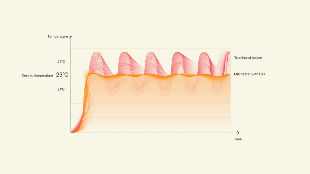 The Mill Invisible WiFi Panel Heater uses PID control — the first to do so, apparently — to accurately maintain its temperature and minimise large fluctuations that require more energy to rectify (see graph below). That, and the fact that you can set when you want it to turn on, how long it should operate, and your desired temperature, means it might be capable of something resembling economical. However…