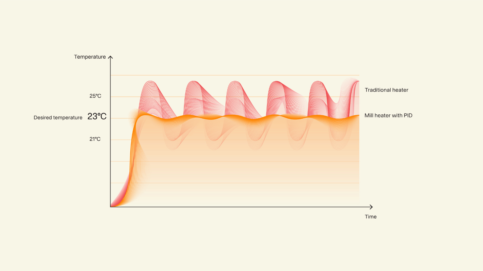 The Mill Invisible WiFi Panel Heater uses PID control — the first to do so, apparently — to accurately maintain its temperature and minimise large fluctuations that require more energy to rectify (see graph below). That, and the fact that you can set when you want it to turn on, how long it should operate, and your desired temperature, means it might be capable of something resembling economical. However…