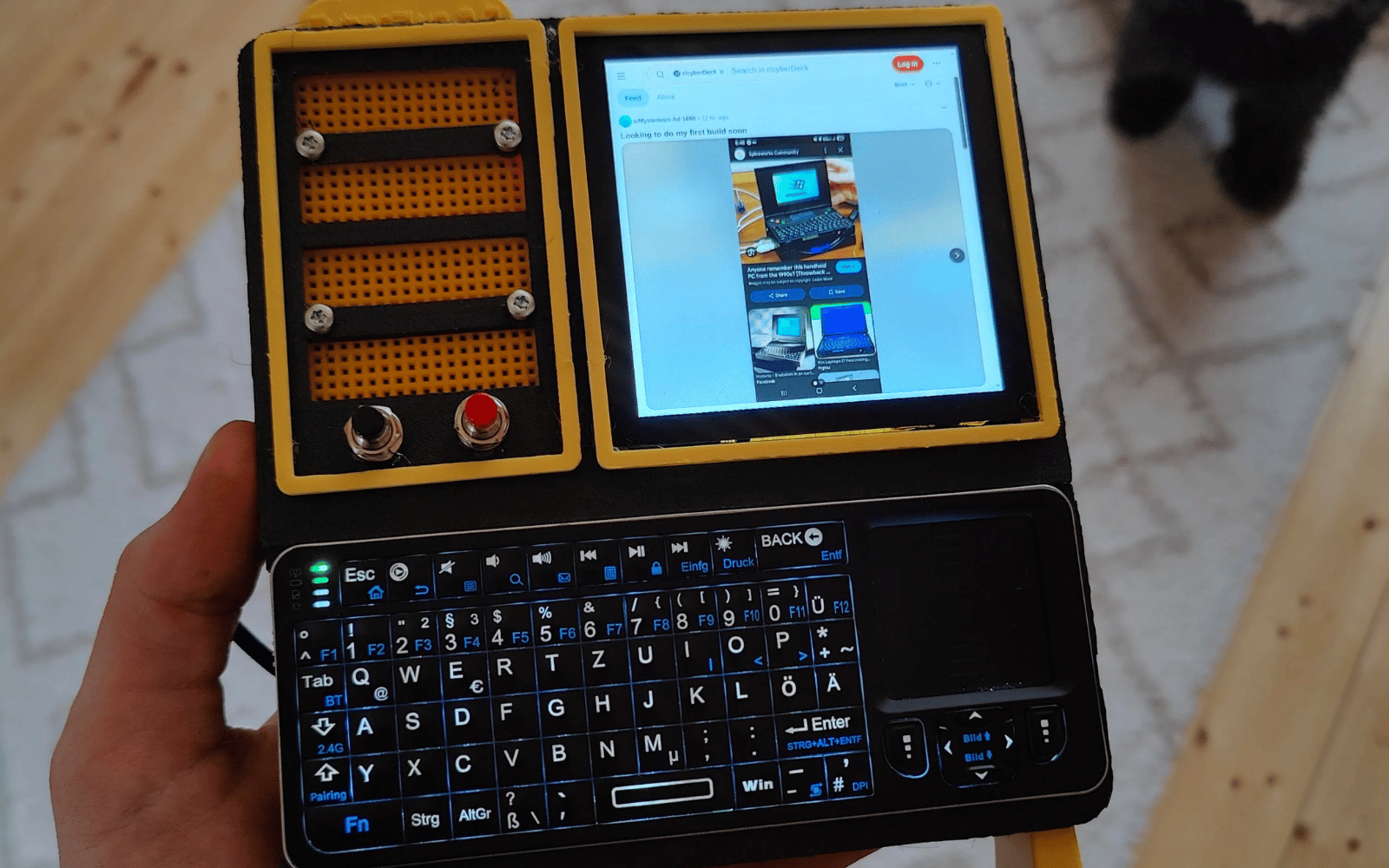 A 5,000mAh power bank runs the whole setup, while the 3D-printed chassis has been improved over previous generations of the device. The ergonomics have been tweaked, the breadboard and motherboard can be accessed by removing the rear panel, and it even supports a secondary monitor and desktop usage if needed.