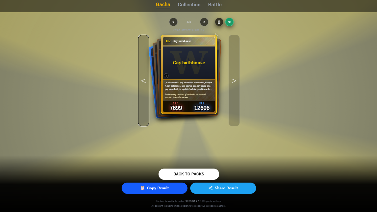 It’s not quite the rush you’d feel pulling some rare Pokémon card out of a pack, but Wikipedia Gacha does the best to imitate that feeling. For free. A new browser-based game by the name of Wikipedia Gacha has sprung up in the past few days, turning those random Wikipedia entries into a collectable trading card gacha game. It’s awesome.