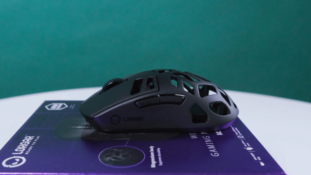 We weren’t the biggest fans of this switch implementation in the Lorgar MSE90W initially. Mechanical switches usually have a metallic sound, and that’s amplified here by the metal body. Thankfully, we found that it faded pretty quickly the more we used it. There’s a bit more pre-travel in the main clicks than we hoped for, but when they do actuate, they feel crisp. The side buttons are well placed and don’t have the same pre-travel as the main clicks.
