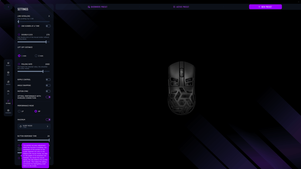 The Lorgar MSE90W uses PixArt’s flagship PAW3395 sensor. This is what allows for the maximum 26,000 CPI (counts per inch) and the 4,000Hz polling rate. It also enables a few other useful features in Lorgar’s software. However, the implementation of those is one of the areas that could use a bit of polish.